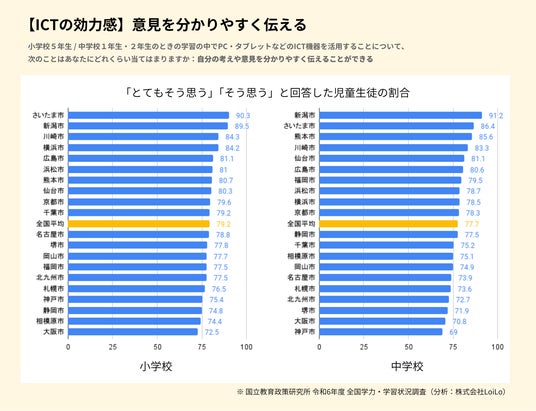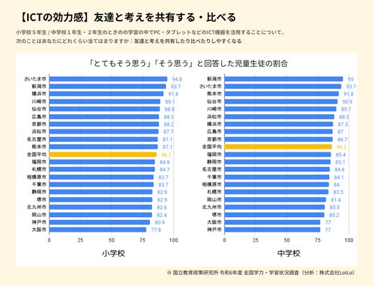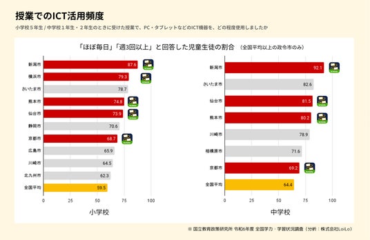 株式会社LoiLoは、「令和6年度 全国学力・学習状況調査」の調査結果を分析し、児童生徒のICT活用頻度と効力感についてまとめました。都市間で大きな差が見られる中、活用率が全国平均を上回る政令市の半数以上が「ロイロノート・スクール」を利用していることが明らかになりました。