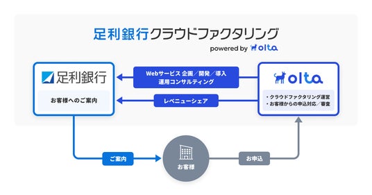 OLTAと足利銀行とのクラウドファクタリング事業における提携では、OLTAがWebサービスの企画・開発・導入および運用におけるコンサルティングを足利銀行に提供し、足利銀行は法人・個人事業主のお客様にサービスをご案内します。