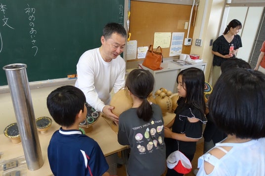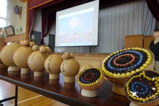米沢市立興譲小学校での花火講座で花火模型を実際に触る子どもたち