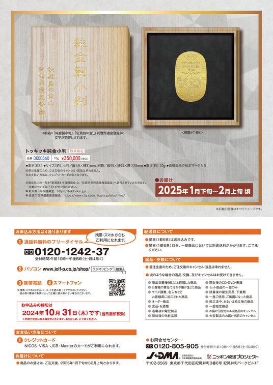 (株)ニッポン放送プロジェクトでは、7月27日(土)に「佐渡島の金山」が”世界文化遺産”に登録されたことを記念して制作した「トッキッキ純金小判」の予約受付期間を好評につき、延長しました。