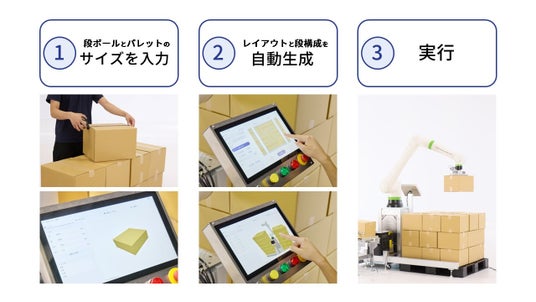 段ボール等の積み付け作業を自動化する小型協働パレタイズロボット。段ボールとパレットのサイズを入力するだけで、積みレイアウトと段構成が自動生成される 「AutoLayout(オートレイアウト)」機能を搭載。