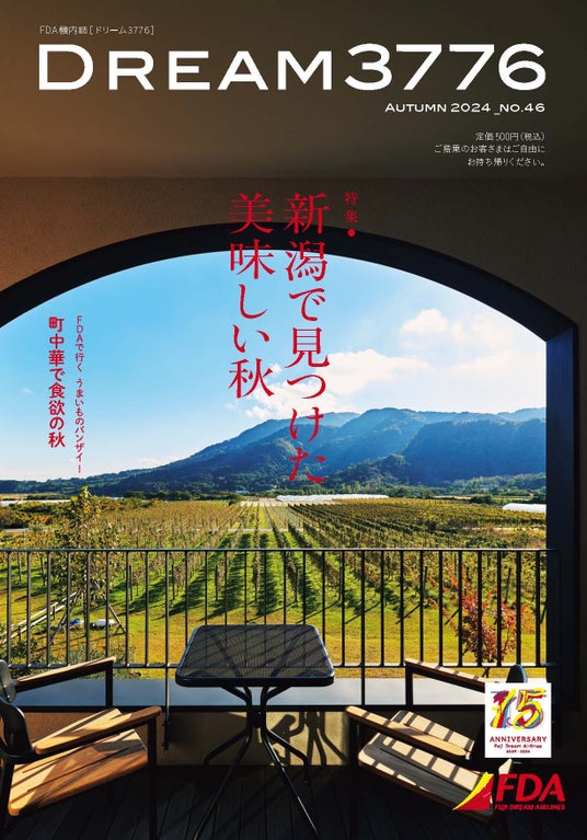 今回の機内誌「DREAM3776 ”2024年秋号”」では、「新潟で見つけた美味しい秋」をテーマに「新潟ワインコースト」と呼ばれる新潟西海岸や「鮭の聖地 村上」を巡りながら、食文化に富んだ秋の新潟を紹介します。FDA便にご搭乗の際は、同機内誌をお楽しみください。