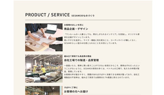 お客様のニーズを形にする商品企画・デザイン、高品質な家具を提供する自社工場での製造・品質管理、そして迅速かつ丁寧な配送。SESAMEのものづくりへのこだわりも掲載しています。