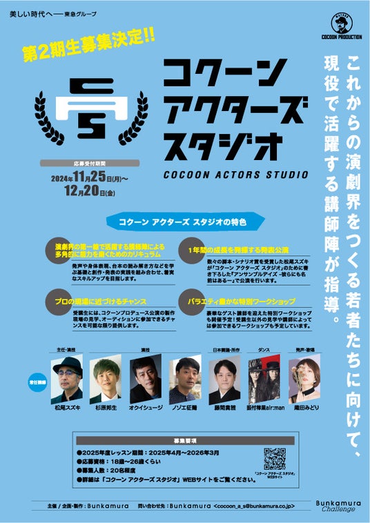 また、若い才能の発掘・育成を継続的に行っていくべく、「コクーン アクターズ スタジオ」第2期生の募集も決定しました。