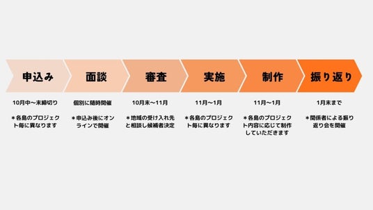 プロジェクトごとに実施時期は異なりますが、概ね下記のスケジュールで進みます。詳細はプロジェクトごとに募集ページをご覧ください。