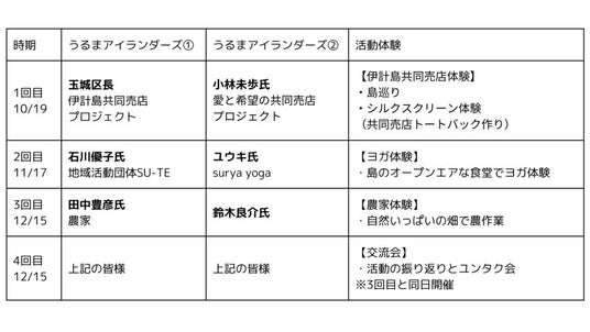 そこで、市は島しょ地域の活性化を図るために、地域活動に興味を持つ方々を増やす取り組みを行います。これに伴い、以下の体験プログラムが実施されます。詳細は「移住検討者向けWEBメディア「うるまで暮らす」」をご覧ください。