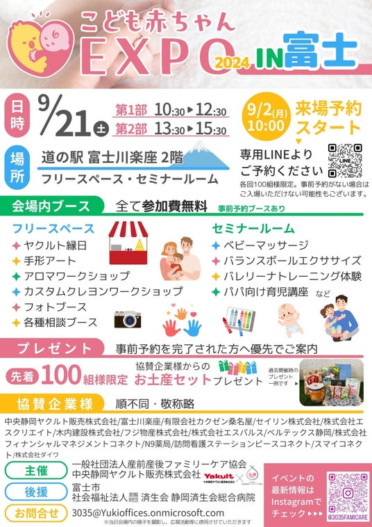 子育てファミリーに楽しみや正しい情報、繋がりを提供することを目的として、2023年3月より非営利で開催しているこども赤ちゃんEXPOは、これまでに宮城県仙台市、秋田県秋田市、山形県酒田市、静岡県静岡市、茨城県日立市で開催し、今回の静岡県富士市で6回目の開催となりました。静岡県内での開催は2024年3月の静岡市での開催に続き2回目で、今回も中央静岡ヤクルト販売株式会社様と共同で主催。富士市と社会福祉法人恩賜財団済生会 静岡済生会総合病院様から後援していただきました。