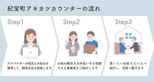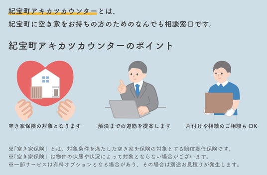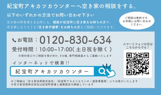 協定により、アキカツが持つ空き家の利活用等のノウハウを生かし、官民が連携し、同町内の空き家対策の推進を図る取り組みを行ってまいります。また、この協定を機にアキカツは、同町内の空き家の適正管理や利活用に関する啓発活動を行うとともに、空き家専門の相談窓口である「紀宝町アキカツカウンター」を2024年11月1日に開設し、紀宝町にて事業展開してまいります。