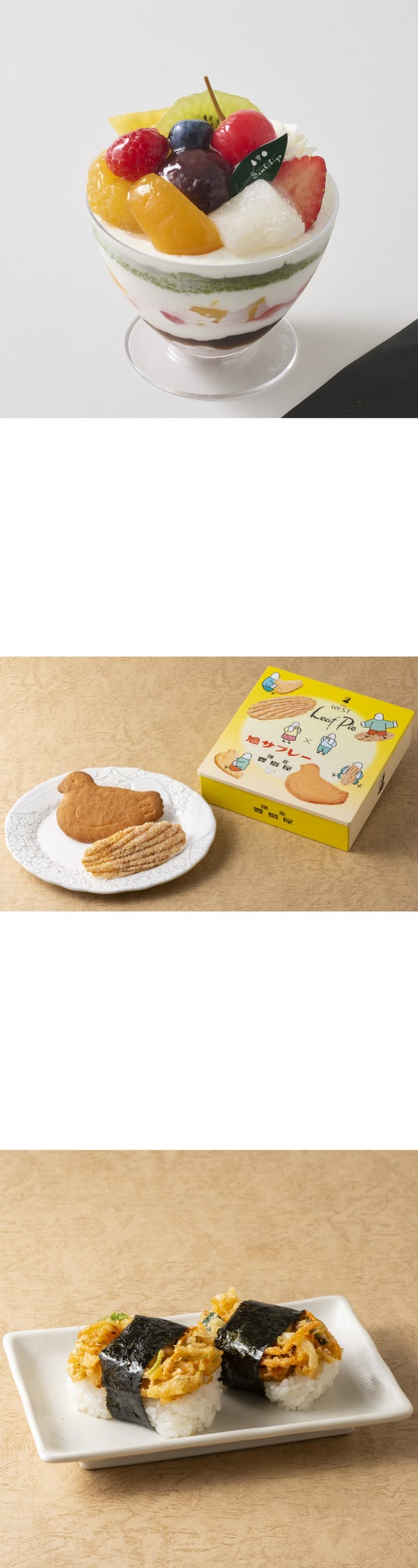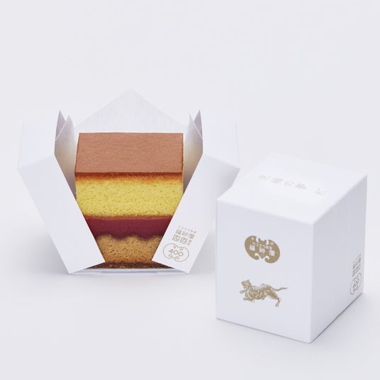 上段は福砂屋のカステラ、中段はとらやの紅煉羊羹(べにねりようかん)、下段はカステラの材料にとらやのさらし餡を混ぜたオリジナル生地を一緒に焼き上げた特別な一品。東横のれん街60周年記念の際に限定販売した菓子を、福砂屋400周年を祝して特別に販売します。