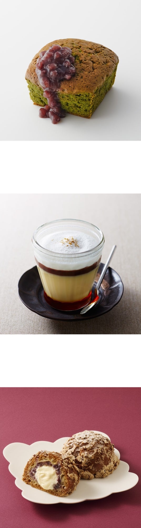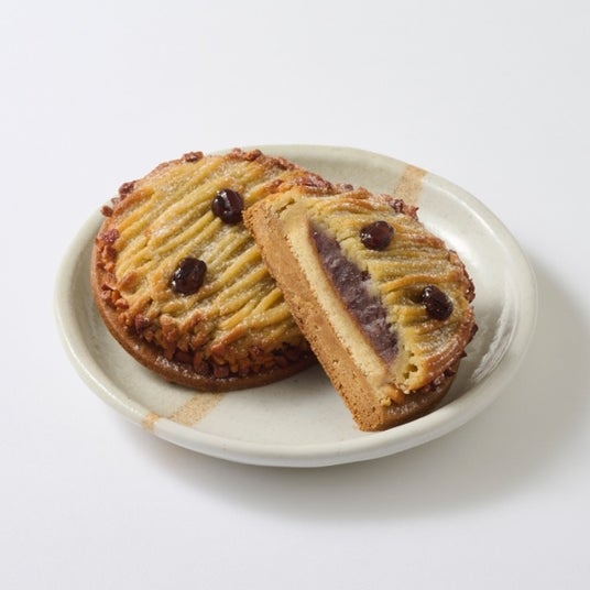 沖縄黒糖を使った厚焼きサブレに、北海道産小豆のクリームを挟んだアーモンドビスキュイを重ね、栗・さつまいも・カスタード・白あんを合わせたクリームを絞った和の焼きモンブラン。トッピングの大納言かのこが食感のアクセントになっています。