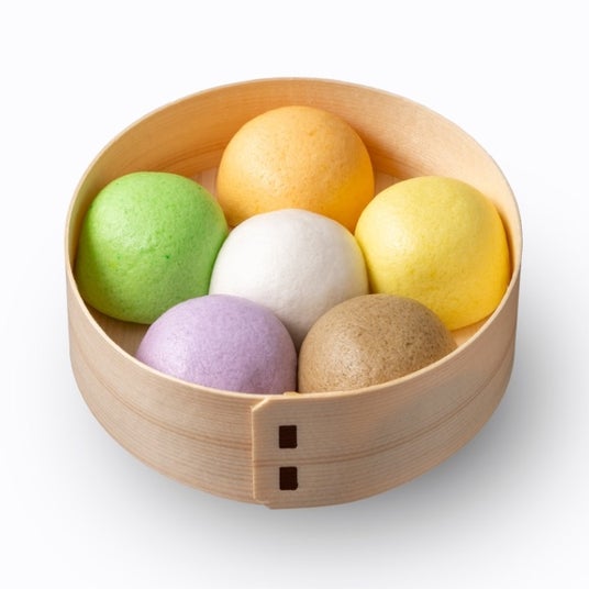 秋らしいいも・栗・ぶどう・青りんご・みかんの5種類の餡と小豆あんを包んだ、色とりどりの薯蕷饅頭(じょうよまんじゅう)。わっぱに入っているので、手土産にもぴったりです。