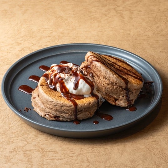 「ポール バセット」のふわふわパンケーキと「ル ショコラ ドゥ アッシュ」のチョコレートがコラボ。パンケーキの中には、香り高いマダガスカル産カカオのガナッシュを入れ、チョコソースにはフルーティーな香りが特長のエクアドル産ショコラを使用した特別な一品です。