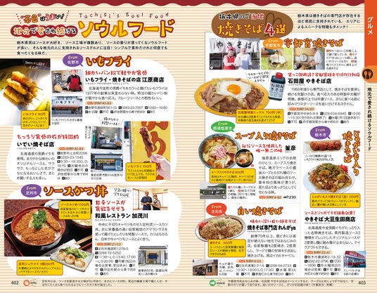 「宇都宮餃子」「佐野らーめん」といった栃木県が誇る全国区グルメは編集室が推す厳選店舗はもちろん、その由来や特徴までを詳しく紹介。生産量全国1位の「イチゴ」は品種や旬の時期も網羅しています。そのほか「いもフライ」「焼きそば」といったソウルフードに、隠れた名物「絶品そば」まで全方位的にカバー。おいしい水と米で作った「日本酒」は、酒蔵見学とともに楽しんでください。