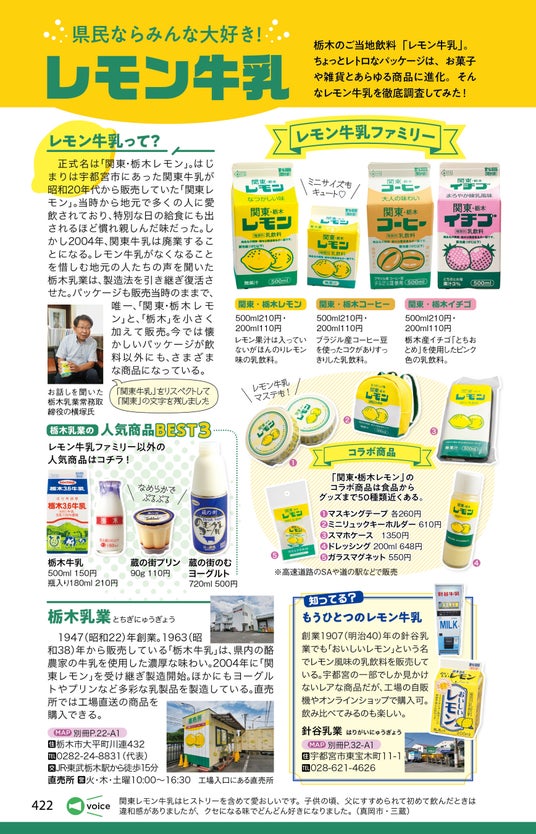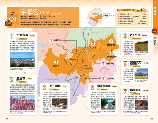 エリアページでは栃木県内14市11町をそれぞれ詳しく紹介。各市町の見どころ・体験・グルメやショッピングに加え、エリアに合わせた小特集も満載です。ところせましと盛り込んだ「ウチも寄ってがっせ」コラムや、ページ下部には読者アンケートで投稿のあったクチコミ紹介と編集室のこぼれネタを入れ、細部まで読み応え十分!