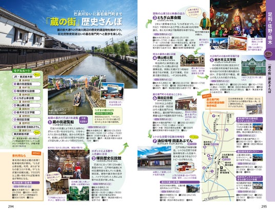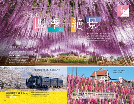満開になった春のフジ、鮮やかな夏の竹林、紅葉に染まる秋の中禅寺湖、白銀の世界となる冬の華厳の滝など……栃木で見るべき最高の景色を四季絶景として大特集。注目を集める日本遺産「大谷石文化」を体験できるモデルプランや、巴波川周辺の歴史的建造物めぐりなど、さまざまな角度から「絶景」を特集しています。
