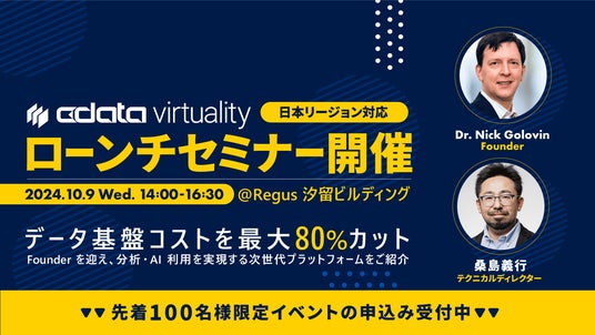 2024年10月9日(水)に、CData Virtuality のFounder(CData が2024年4月に買収したドイツのData Virtuality 社のCEO)であるDr. Nick Golovin が来日し、ローンチセミナーを開催いたします。分散する業務データの分析利用・AI 利用にご関心のある方、データ分析基盤のコスト増加にお悩みの方、エンタープライズレベルで管理できるデータ基盤をお求めの方は、是非この機会にご参加ください。