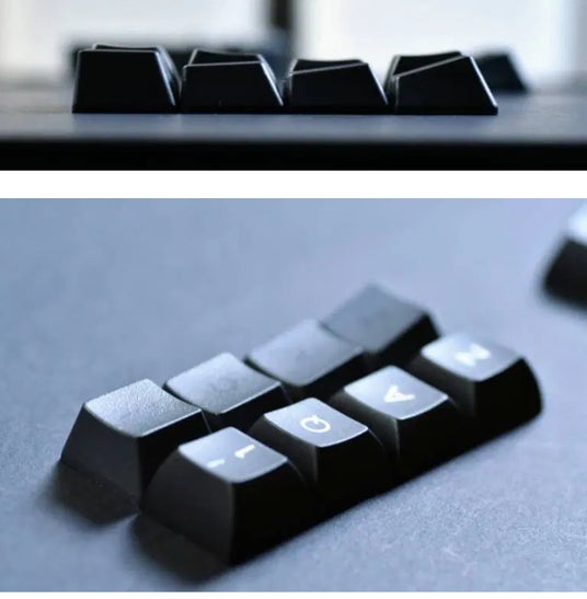 今回のキーキャップは、 2色の樹脂を用いて作成する「ダブルショット(2色成型)という手法で作成されており、摩耗によって物理的に印字が消えないメリットがあるほか、ポインティングスティックの形状に合わせての印字が難しい「B」についても、立体表現とすることで、アルファベットの形を損なうことなく、形状を作り出すことに成功しました。
