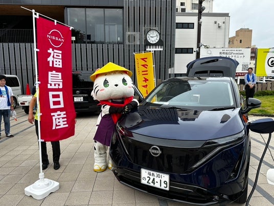 また、計量時間中には環境にやさしい電気自動車「日産アリア」を紹介し、大会中を通して展示いたしました。福島日産が2024オフィシャルクラブパートナーおよびSDGsパートナーをつとめる福島ユナイテッドFCの公式マスコット「虎百」も日産アリアに興味津々。
