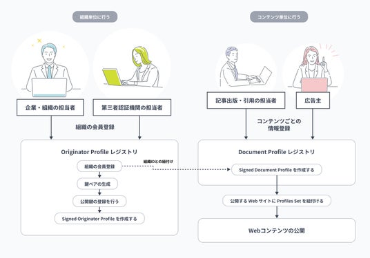 本組合は、安全なインターネット環境の提供に向けた技術であるOPについて、ブラウザなどで採用される「Web標準化」を目指しています。OPは、インターネット上のコンテンツ作成者やデジタル広告の出稿元などの情報を検証可能な形で付与する技術です。信頼できる発信者を識別可能にすることで、第三者認証済みの良質なメディアとコンテンツをインターネット利用者が容易に見分けられる仕組みを確立し、偽情報・誤情報(フェイクニュース)やアドフラウド(広告詐欺・不正広告)などの氾濫の抑止にもつなげていきます。