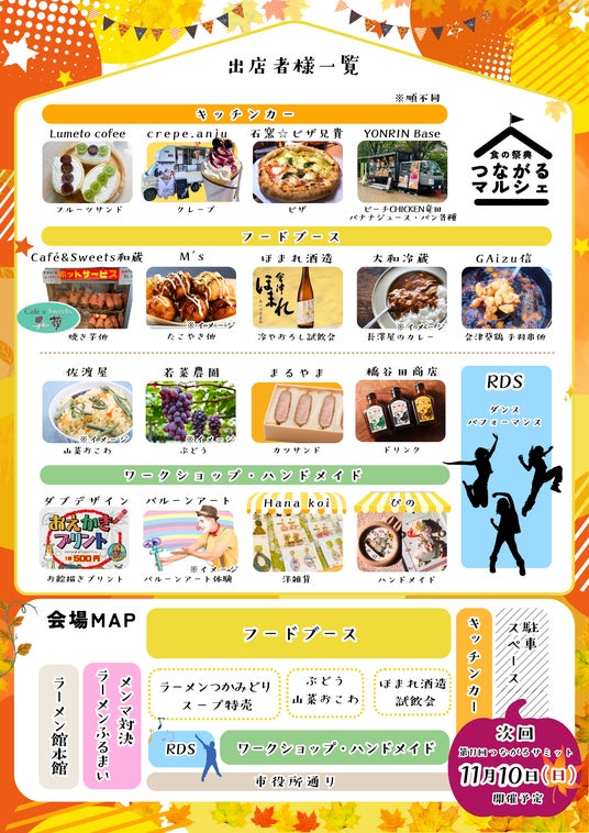 地元企業様や会津地方を拠点としているキッチンカーによるフード、スイーツ、ドリンク販売やひやおろし試飲会。ハンドメイド雑貨出店のマルシェです。バルーンアート、お絵描きプリントのワークショップも開催します。