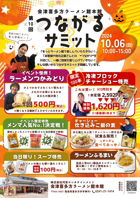 [喜多方ラーメン・お土産販売店] 株式会社河京エンタテインメント会津喜多方ラーメン館本館(本社:福島県喜多方市 取締役社長:土屋充孝)は、【第10回つながるサミット】を10月6日(日)に開催します。このイベントは『お客様・地域企業の皆様とつながる』をテーマに、<自家製冷凍ブロックチャーシューの特売><河京工場直送のラーメンつかみどり><キッチンカー><地元のお店のフード販売><ハンドメイドマルシェ>など企画盛りだくさんでお届けします。