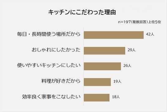 キッチンにこだわった理由として最も多かったのは「毎日・長時間使う場所だから(42人)」。2位は「おしゃれにしたかった(29人)」、3位は「使いやすいキッチンにしたい(26人)」でした。