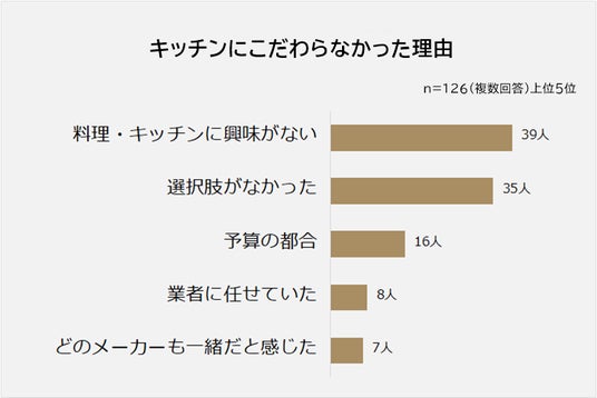 キッチンにこだわらなかった理由の1位は「料理・キッチンに興味がない(39人)」です。建売住宅を購入したなどの理由で、2位「選択肢がなかった(35人)」と答えた人も多くなっています。
