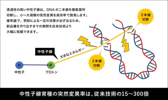 ※1 日本国内及び海外の「加速器を用いた商用の中性子線育種サービス」として世界初。特許3件取得済。2024年10月現在、自社調べ。参照:JATAFFジャーナル 11巻9号(2023) 中性子線を用いた突然変異育種への期待 久保山 勉 ※2 花や野菜、穀物などの植物の場合、 最短1年で新系統を創り出せます。従来技術では3~5年以上かかります。 ※3 ラボレベル