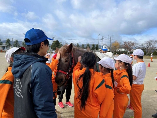 ▲小学校での「馬との触れ合い学習授業」。馬と人が共に紡ぐ景色を未来にも残していくために様々な取り組みが必要。