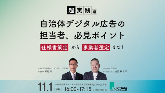 sembear合同会社(エスイーエムベア合同会社 本社:東京都渋谷区 CEO:治田耕太郎)は、2024年11月1日に一般社団法人デジタル広告品質認証機構(JICDAQ)が主催する自治体職員向けウェビナー「デジタル広告基礎講座」に代表の治田が登壇しますことをお知らせいたします。当日のウェビナーでは、多くの地方自治体のデジタルマーケティング支援・アドバイザリーを務めている経験をもとに、自治体がデジタル広告を実施する上で必要不可欠な「予算の立て方」「仕様書策定」そして「プロポーザル審査」に至るまでを徹底解説いたします。デジタル広告に携わる自治体職員の皆様は是非ご参加ください。