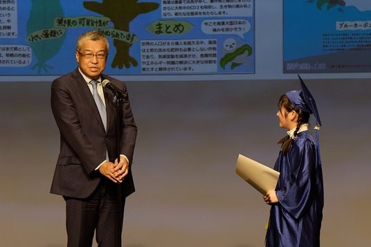 東京都小学4年生の綾音さんが、羽田未来総合研究所賞を受賞。当社社長の大西が表彰状を授与しました。