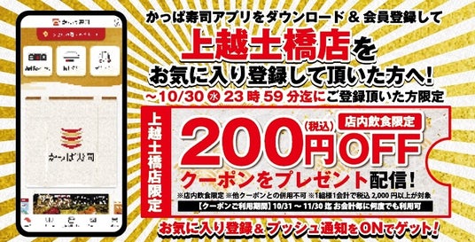 公式アプリ(https://www.kappasushi.jp/app.html)をダウンロード&会員登録いただき、10 月 7 日(月)から10 月 30 日(水)23 時59 分までに『上越土橋店』をお気に入り登録いただくと、10 月31 日(木)から11 月 30 日(土)まで、お会計毎に何度でもご利用いただける“店内飲食限定200円(税込)OFFクーポン”をプレゼント配信いたします。