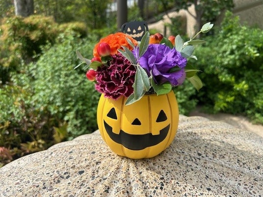 フラワーショップ「レ ミルフォイユ ドゥ リベルテ」主催のかぼちゃの器と季節のお花を使ったアレンジメントワークショップ。飾るだけでハロウィン気分を盛り上げてくれるアレンジメントをご提案します。