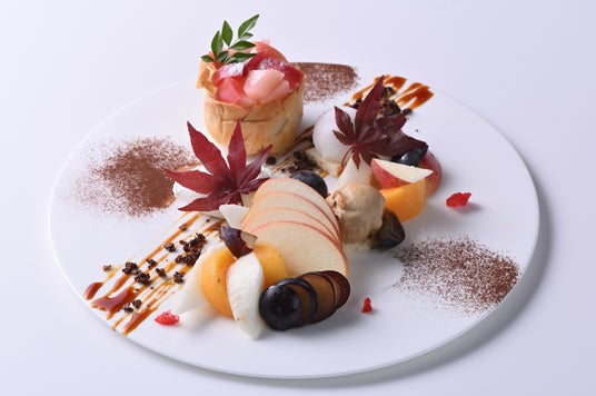 パリパリに焼きあげたパイ生地の中に、なめらかなディプロマットクリームと甘酸っぱいりんごのコンポートが入った自家製アップルパイと、秋を感じさせる果物をあわせた一皿です。