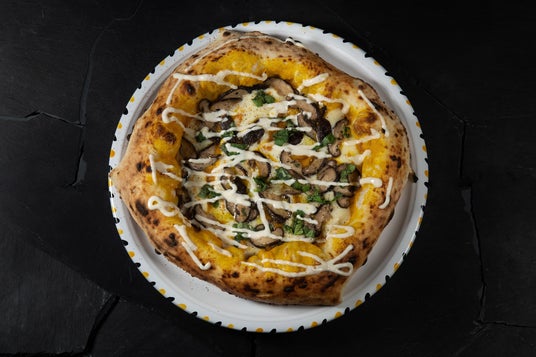 かぼちゃクリームのピッツァです。かぼちゃのクリームの上に、ナポリのモッツァレラ椎茸ソテーをのせて焼き、バジルと燻製モッツァレラクリームで仕上げてあります。