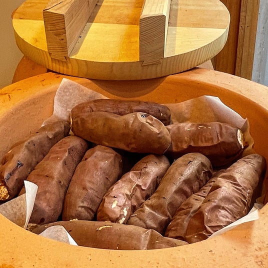 東京西小山にある壺焼き芋cafeです。厳選したさつまいもを特製の壺の中に吊るし、炭火でじっくり時間をかけてひとつひとつ丁寧にしっとり甘~く焼き上げます。季節に合わせて一番美味しい品種を数種類セレクトして焼いています。