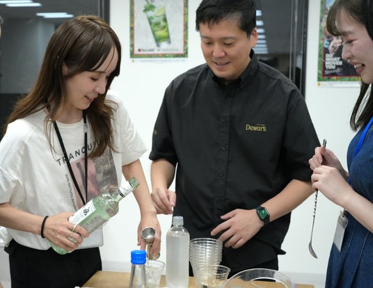 今回はデュワーズ12年のハイボール、バカルディゴールドハイボール、ボンベイ・サファイアジントニック、マルティーニスパークリングワインなどの提供やブランドについての説明、モヒートを自分で作るワークショップを実施しました。