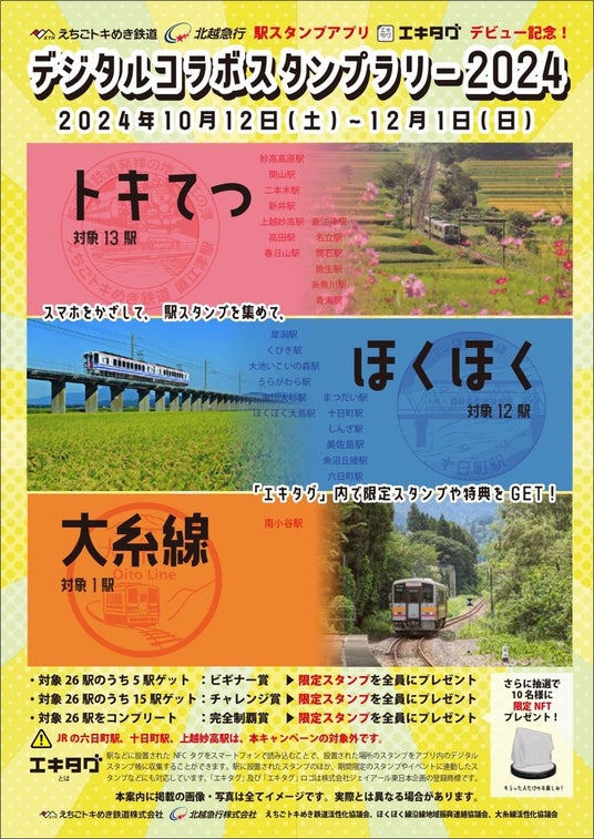 ◎株式会社ジェイアール東日本企画が提供する駅スタンプアプリ「エキタグ」では、2024年10月12日(土)より、新潟県エリア「えちごトキめき鉄道」「北越急行」にエキタグがデビューします。