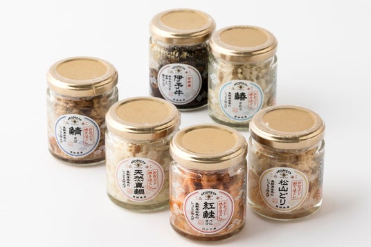 後ろ左から時計回りに)伊予牛の甘辛煮 900円/鰆の焼きほぐし 700円/松山どりの茹でほぐし 680円/紅鮭の焼きほぐし 750円/天然真鯛の焼きほぐし 750円/鯖の焼きほぐし 680円