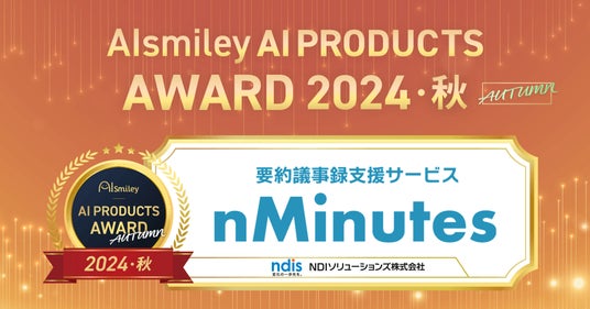 NDIソリューションズ株式会社(本社:東京都港区、代表取締役社長:岩井 淳文、以下NDIS)が提供する要約議事録支援サービスnMinutesが、株式会社アイスマイリー(本社:東京都渋谷区、代表取締役:板羽 晃司)の主催する AIsmiley AI PRODUCTS AWARD 2024 AUTUMN にて、数多くの議事録作成AI部門の製品の中からアワードを受賞しました。