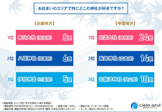 株式会社cielo azul(本社所在地:福岡県福岡市、代表取締役:大泉 聡)は、神社めぐりが好き(趣味)な方を対象に、【エリア別】「好きな神社」に関する調査を実施しました。
