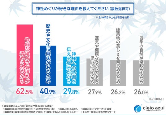 神社巡りが好きな理由TOP3は「気持ちが清められる」「建築や自然の美しさが気に入っている」「自然に囲まれていてリラックスできる」
