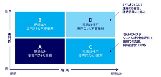 組織分析やヒアリングから現状を分析し、仮説を設定します。その上で、ミドルオフィスのコンセプトを検討。具体的には、現場以外でも対応可能かつ専門スキルが不要な業務(D)、現場以外でも対応可能かつ専門スキルが必要な業務(C)において、現場とのコンセンサスを得ながらミドルオフィスへの移管を目指します。分業化により現場の働き方を見直し、現場担当者の余剰リソースを主体業務ならびに教育などによる本業のスキル向上へ生かし、関連部門全体での生産性向上を図ります。