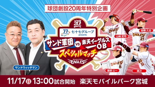 株式会社楽天野球団(本社:宮城県仙台市宮城野区、代表取締役社長:森井 誠之)は、球団創設20周年特別企画として、「七十七グループpresents サンド軍団VS楽天イーグルスOBスペシャルマッチ」を開催することとなりましたので、お知らせいたします。