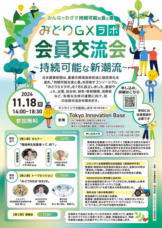 株式会社日本農業新聞(東京都台東区、代表取締役社長:田宮和史郎)は、持続可能な食と農の実現を目指すコンソーシアム「みどりGXラボ」の会員交流会を、2024年11月18日(月)に東京・有楽町の東京イノベーションベースで開きます。7月のラボ設立後初めて、環境に配慮した農業に関心を寄せる全国の農家や消費者、地方自治体、企業などの会員が一堂に会し、自由に意見交換ができます。