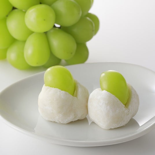 マスカット大福マスカットの果汁を使用した大福にシャインマスカットをはさみました。シャインマスカットの果実のフレッシュ感と大福の甘味がとてもよく合います。