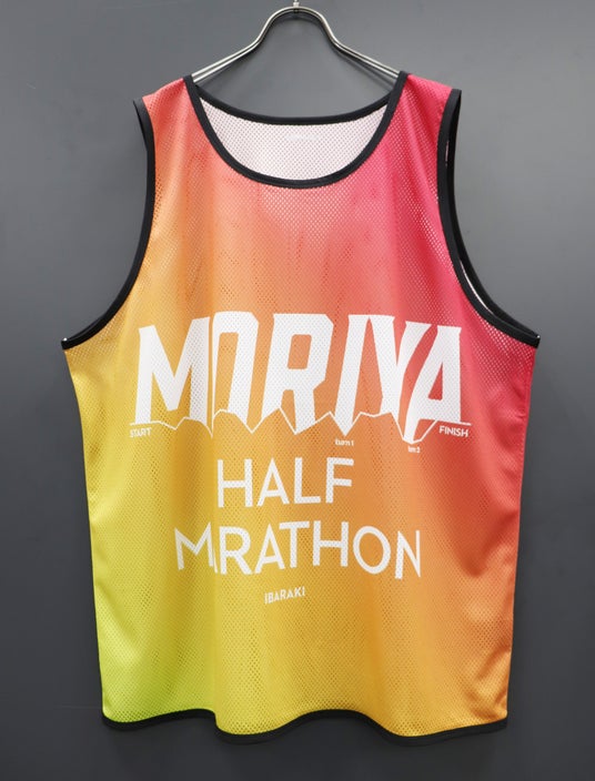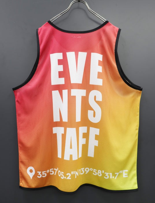 スポーツメッシュ素材を使用し、アウターの上からも着られるようオーバーサイズで作られたビブス。視認性の高いイエロー~オレンジのグラデーションボディにフロントにはメインロゴを、バックには大きく『EVENT STAFF』の文字と、レースのスタート地点である守谷市役所の緯度・経度を表した座標をプリントしています。