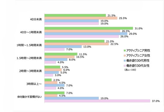 1日に費やす運動や活動量の時間を聞いたところ、「40分~1時間未満」がシニア世代(男性31.0%、女性26.5%)および30代男性(29.0%)ともにトップの回答となりました。特に、シニア世代は「40分~1.5時間未満」にまで回答を広げると約半数(シニア男性52.0%、シニア女性49.0%)という結果に。そして、Q2の通り、30代女性のトップは「体を動かす習慣がない」(37.0%)となりました。