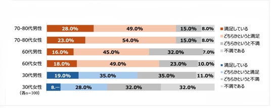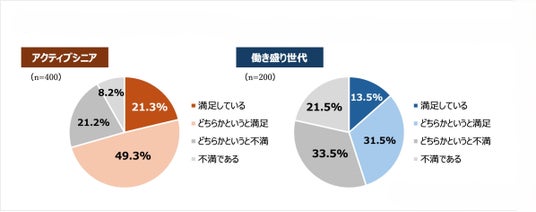 アクティブシニア7割超(70.6%)が「満足」! 働き盛り世代で「満足」は45.0%と半数にも満たず