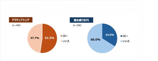 「健康づくりのための身体活動・運動ガイド2023」(歩行または同等以上の身体活動を成人は1日60分、高齢者は1日40分)の基準をクリアする働き盛り世代は34.0%、アクティブシニアは過半数52.3%!